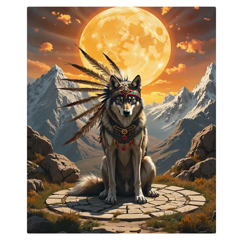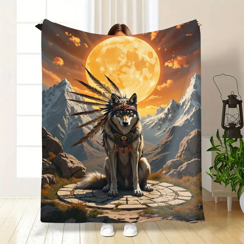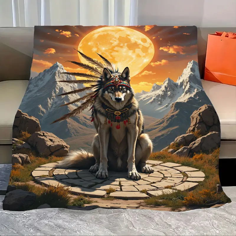 1pc Flannel Blanket Native Wolf with Headdress on Mountain Path Blanket