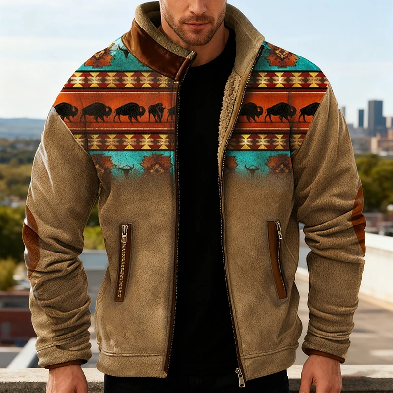 Aztec Patchwork Print Fleece Jacket Men Fall Winter Warm Fleece Lining Outerwear Men Vintage Zipper Stand Collar Coat Jackets
